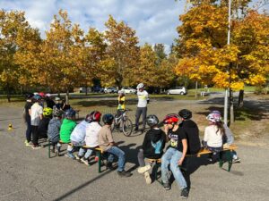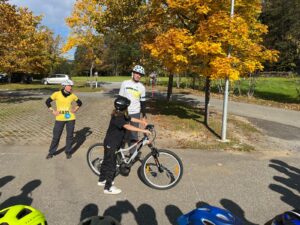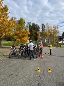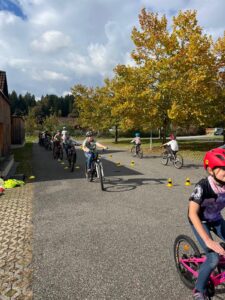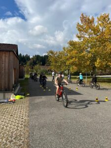 Zuerst wurden der richtige Sitz des Helms und die Teile des Fahrrads besprochen. Endlich ging es dann auf die vorbereitete Trainingsstrecke. Bremsübungen und Geschicklichkeitsfahren standen auf dem Programm. Alle Kinder nahmen an diesem Fahrradkurs begeistert teil – und außerdem war dieser Übungstag die perfekte Vorbereitung für die bevorstehende Fahrradprüfung.